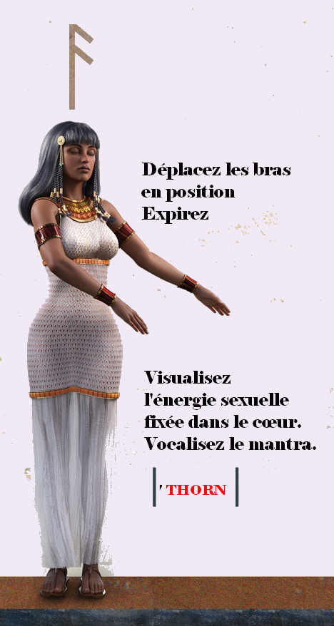 Premièrement, effectuez la Rune Thorn ou Dorn en plaçant votre main droite sur votre taille, formant ainsi la bonne Thorn (bonne volonté) qui signifie volonté, Thelema.- Deuxièmement, effectuez la Rune Os en plaçant vos deux bras droits vers le bas tout en tournant votre tronc vers la gauche ; les deux bras représentent Ida et Pingala, la partie inférieure de la clé.