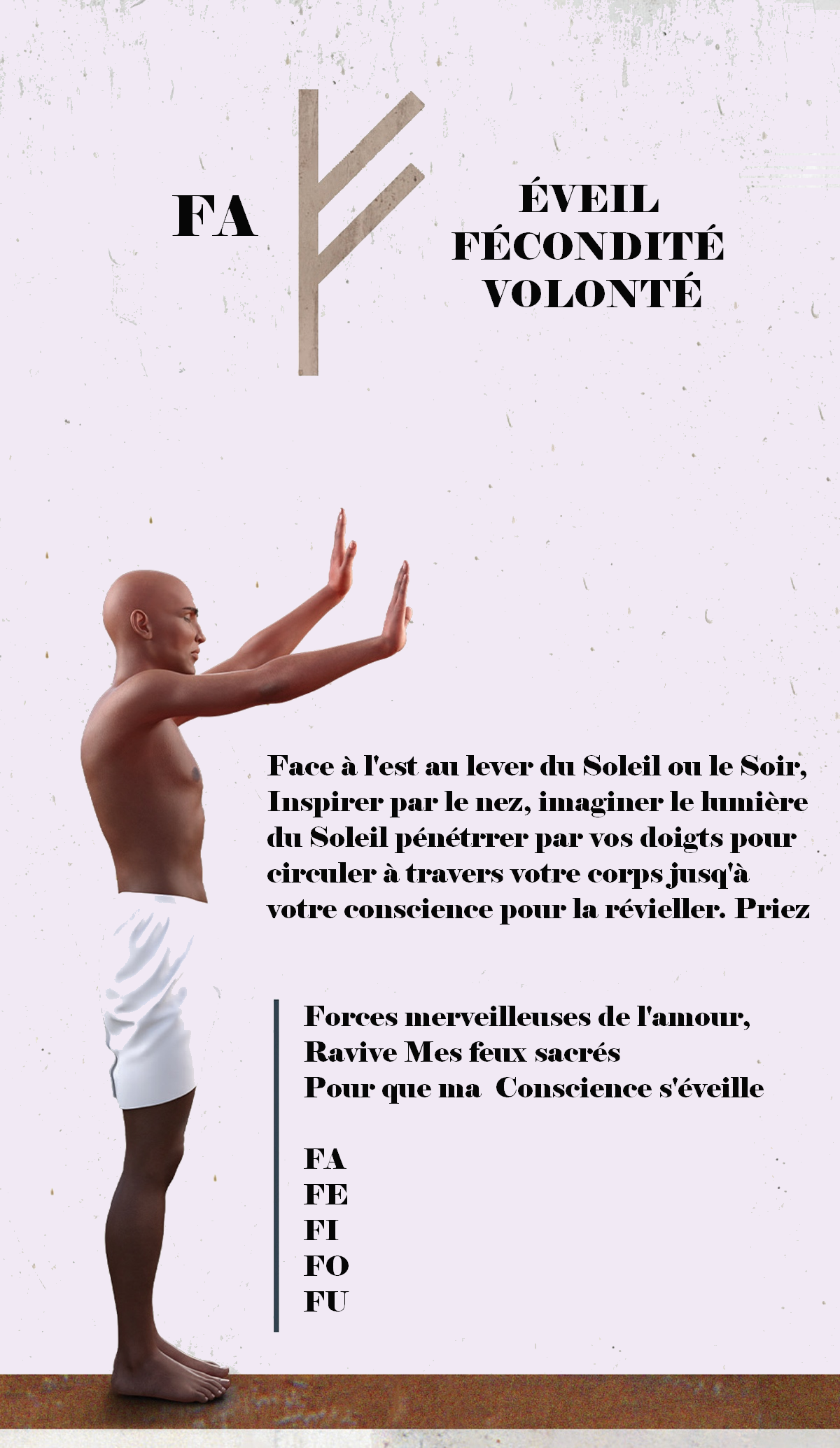 Comme vous pouvez le voir, la Rune Fa est physiquement faite quand nous mettons nos bras dans une position horizontale droite avec le corps vertical ; le bras gauche un peu plus haut que le droit.