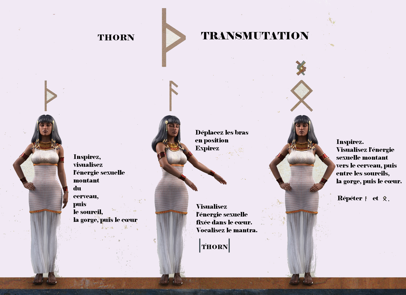 Durant les exercices ésotériques, il faut alterner en plaçant successivement les bras tantôt dans la première position, vers le bas, et tantôt dans la deuxième position, les mains posées sur la taille comme dans la Rune Dorn ou Thorn. Je répète : examinez attentivement les deux signes graphiques de la Rune Os.